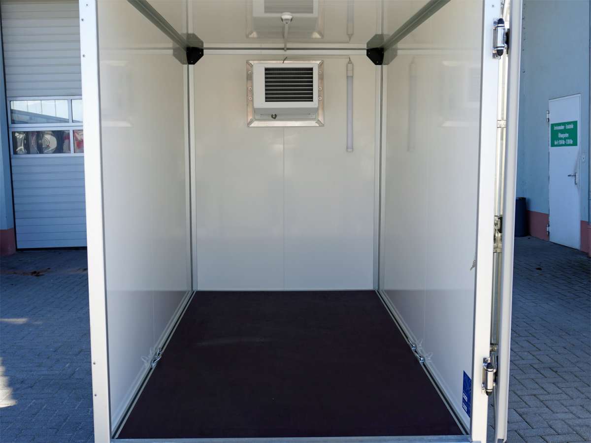 Der Einachs-Sandwichkoffer für den gekühlten Transport Ihrer Ware. Der Rahmen und das Fahrwerk sind aus feuerverzinktem Stahl gefertigt und verleihen dem Sandwichkoffer eine lange Lebensdauer. Der Boden der Sandwich-Koffer besteht aus mehrfach wasserfest verleimtem Spezialholz mit rutschhemmender Phenolharzbeschichtung. Der Aufbau besteht bei diesem Koffer aus einer 30 mm starken Sandwichpaneele mit einem Kern aus geschäumten Polyurethan mit einer beidseitigen Deckschicht aus verzinktem und polyesterlackbeschichtetem Stahlblech. Die Einfassungen des Sandwichkoffers sind aus eloxiertem Aluminium, ebenso wie das verwindungssteife Heckportal und die Regenrinne am Heck. Die Türscharniere, der abschließbare Drehstangenverschluss und die Türfeststeller sind aus Edelstahl gearbeitet. An den Türen sind Dichtungen aus Kunststoff montiert, die ein wassergeschütztes transportieren Ihrer Ware ermöglichen. Der Einachs-Sandwichkoffer von Humbaur ein unerlässlicher Helfer für den geschützten gekühlten Transport.
